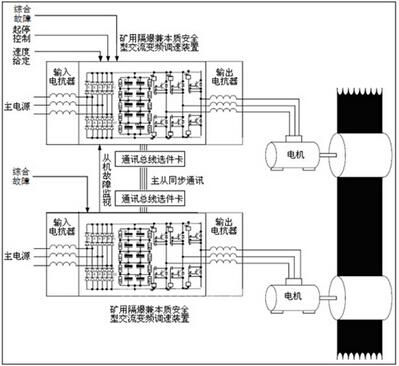 防爆變頻器帶動(dòng)膠帶輸送機(jī)工作時(shí),采用主從聯(lián)動(dòng)方式。主機(jī)的輸出作為從機(jī)的給定,從機(jī)跟蹤主機(jī)的主參數(shù),主從機(jī)的數(shù)據(jù)交換通過通訊線路進(jìn)行。具體可以根據(jù)膠帶輸送機(jī)機(jī)械驅(qū)動(dòng)裝置的布置作調(diào)整。