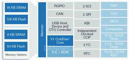 例如,飛思卡爾半導體公司的ColdFire系列32位微處理器具有100%的模塊化架構,因此更易于與存儲器、系統(tǒng)模塊和通信外設相集成,從而有效提高了芯片的集成度,且更容易適應新的加工工藝。如圖1 所示,基于ColdFire V1內(nèi)核的MCF51JM128器件除了集成16KB SRAM,還具有高達128KB的片上閃存,使用戶在各種實際環(huán)境中都可以充分利用在線編程功能。有效的利用片上存儲器能使工程師不需要再用損失性能的代價去換取更低的系統(tǒng)成本。