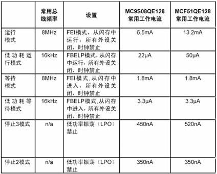 在低功耗性能方面,飛思卡爾的MCF51JM128共有四種低功耗模式,能在低功耗的狀態(tài)下繼續(xù)執(zhí)行采樣功能,有助于降低系統(tǒng)總功耗。如表1所示,F(xiàn)lexis系列的首款產(chǎn)品QE128(MC9S08QE128 和MCF51QE128)除了正常工作模式還有以下五種節(jié)能模式。