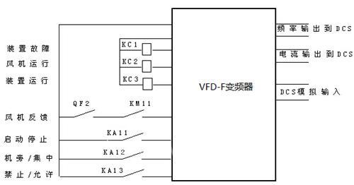 遠(yuǎn)程控制原理:KA12閉合選擇變頻器第二套控制參數(shù);KA13閉合允許變頻器工作;KA11閉合,變頻器運行;KC3得電提供信號接點;KC2得電控制電機風(fēng)扇運行。