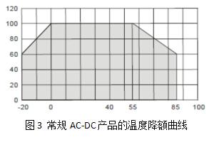目前,大多數(shù)常規(guī)電解電容的額定工作溫度為105℃,但因電解電容在高溫條件下電解液易揮發(fā),電源本身發(fā)熱較大等原因,常規(guī)采用電解電容的AC-DC電源只能工作在70℃的環(huán)境條件下。要提高電源的工作環(huán)境溫度,必須采用價格更昂貴、體積更大的電解電容,或者以降額的方式實現(xiàn)高低溫條件下的應用,下面以金升陽常規(guī)AC-DC電源產(chǎn)品在高低溫環(huán)境下的降額要求如圖3: