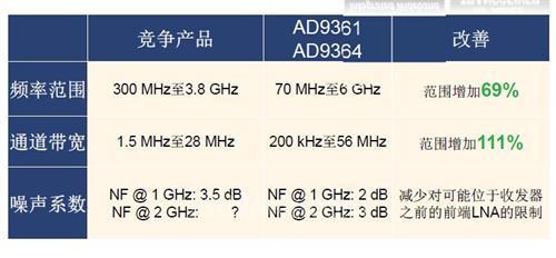 在關(guān)鍵特性上,AD936x實現(xiàn)了極大的突破,這是其獲得市場極大成功的關(guān)鍵。頻率范圍與競爭產(chǎn)品相比改善69%以及通道帶寬增加111%,這對于任何關(guān)注SDR技術(shù)應(yīng)用的企業(yè)來說,都是“難以抗拒”的誘惑?!昂透偁帉κ直仁俏ㄒ灰豢钫嬲梢杂玫?,市場上的同類產(chǎn)品,只到3.8G,帶寬28兆,但不支持GSM的200KHz帶寬,1GHz的噪聲系數(shù)是3.5dB,2GHz就不敢標(biāo)了,而我們分別是2dB和3dB?!?Eagle指出。