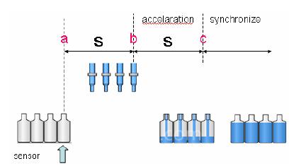 Kinco 伺服做為全智能的交流伺服系統(tǒng),內(nèi)部強大的編程能力可以實現(xiàn)對伺服電機的靈活控制。通過伺服驅(qū)動器內(nèi)置的比較器自行判斷跟蹤位置,實現(xiàn)自動切換控制模式的目的。整個系統(tǒng)采用X、Y兩軸伺服控制,X軸本系統(tǒng)采用KINCO為客戶定制的特殊FIRMWARE來實現(xiàn)同步跟隨控制,如圖3所示,b點是罐裝頭原點位置,a、b兩點間距離S是指X軸跟隨啟動瞬間罐裝頭距藥瓶口中心的距離。b、c兩點間距離S就是X軸加速到同步速度的加速距離,也就是說加速距離就等于a、b兩點的距離。