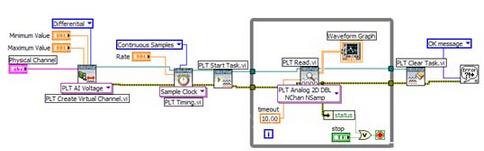 凌華科技為 PCI-9846提供了LabVIEW驅(qū)動。安裝DAQPilot驅(qū)動程序后,在LabVIEW的函數(shù)庫中可以找到DAQPilot工具包,其中提供了數(shù)據(jù)采集的控制函數(shù),其功能與調(diào)用方法與NI的DAQmax對應,使用非常方便。例如,由下圖中的四個函數(shù):PLT Create Virtual Channel、PLT Timing、PLT Read以及PLT Clear Task就構(gòu)成了完整的連續(xù)數(shù)據(jù)采集功能。另外,DAQPilot中還提供了模擬和數(shù)字信號的輸入、輸出等各種功能的LabVIEW范例程序,方便開發(fā)者快速上手。