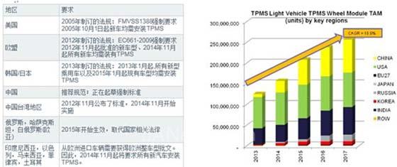 圖示1-世界范圍內(nèi)對胎壓監(jiān)測的相關(guān)法規(guī)和市場需求