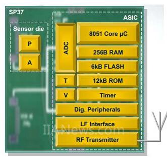 大聯(lián)大品佳代理的英飛凌的SP37系列是SP3x家族的第三代產(chǎn)品,該家族產(chǎn)品自2010年以來已在全球各地銷售超過 2億只。SP37是調(diào)頻范圍為300~450 MHz的胎壓傳感器芯片,內(nèi)部集傳感器、單片機和RF發(fā)射單元于一體,最大輸出功率+8 dBm(50 Ω負載),最低1.9 V工作。其內(nèi)部電路包括電源濾波電路、晶振電路和天線匹配電路等三部分。