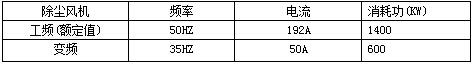 (2)采用變頻運行后,由于電機軸功率下降,除塵風(fēng)機轉(zhuǎn)速降低,減輕了機械振動和噪聲,可延長設(shè)備使用壽命,改善了勞動環(huán)境;