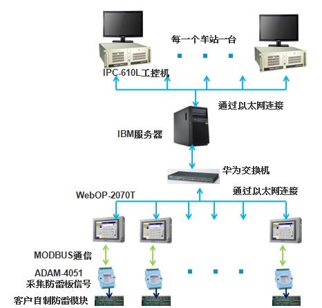 通過ADAM-4051將防雷板狀態(tài)采集上來,傳送給觸摸屏WebOP-2070T,并在觸摸屏上顯示防雷模塊各點(diǎn)位狀態(tài)。WebOP-2070T充當(dāng)網(wǎng)關(guān)的作用,將數(shù)據(jù)通過交換機(jī)傳送給IBM小型服務(wù)器。鐵路沿線各站點(diǎn)控制室中的工控機(jī)通過訪問IBM小型服務(wù)器來查看各防雷板狀態(tài)。當(dāng)防雷板報(bào)警或被雷擊壞時(shí),WebOP-2070T將報(bào)警數(shù)據(jù)發(fā)送給IBM服務(wù)器, IBM服務(wù)器再發(fā)送給鐵路沿線各站點(diǎn)控制室中的工控機(jī),工控機(jī)通過軟件報(bào)警畫面提示給各操作室工作人員。這樣就實(shí)現(xiàn)了任何一臺(tái)工控機(jī)都能監(jiān)控整條鐵路線的防雷系統(tǒng)故障信息,只要任何一個(gè)監(jiān)控室有人值守,就可以了解到故障信息,及時(shí)處理故障,大大節(jié)約了人力成本。