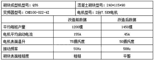 我公司研發(fā)及技術(shù)人員經(jīng)多次現(xiàn)場(chǎng)調(diào)試,根據(jù)振動(dòng)系統(tǒng)的運(yùn)動(dòng)特性,在公司原有CHE系列矢量變頻器的基礎(chǔ)上作了相應(yīng)的軟件及硬件改進(jìn),從而開發(fā)出了CHE系列磚機(jī)專用變頻器。該系列變頻器最大的特點(diǎn)就是能夠在滿足振動(dòng)技術(shù)要求的前提下,省去制動(dòng)單元及制動(dòng)電阻。目前該系列磚機(jī)專用變頻器已成功應(yīng)用于泉州某工程機(jī)械有限公司,以下是該公司生產(chǎn)的砌塊成型機(jī),在使用了CHE系列專用變頻器進(jìn)行前后的生產(chǎn)數(shù)據(jù)對(duì)比: