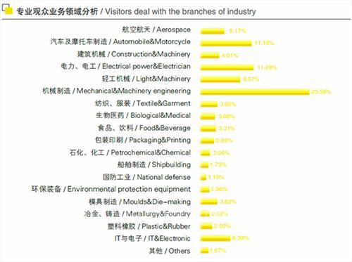 121,108 人次專業(yè)觀眾來(lái)自中國(guó)境內(nèi)31 個(gè)省、市、自治區(qū)和境外82 個(gè)國(guó)家和地區(qū)。他們主要來(lái)自機(jī)械制造、電力電工、汽車及摩托車制造和輕工機(jī)械等領(lǐng)域。