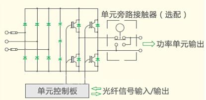 功率單元采用三相交流輸入,整流濾波后形成直流電壓,經(jīng)IGBT H橋逆變后輸出脈寬調(diào)制(PWM)電壓。功率單元控制板由IGBT驅(qū)動電路和監(jiān)測保護(hù)電路、光纖通信電路、單元旁路電路和控制電源組成。運(yùn)行中功率單元故障時(shí),變頻器可將故障單元自動旁路并繼續(xù)運(yùn)行,等情況允許時(shí)再停機(jī)排除故障。
