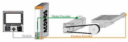 折彎機采用了貝加萊雙編碼器位置控制,伺服驅(qū)動器ACOPOS可以通過外接編碼器作為位置環(huán)反饋,外接編碼器通過直接壓在鋁條上的壓輪讀取位置,可以避免送料傳動過程中產(chǎn)生的誤差,提高送料精度。