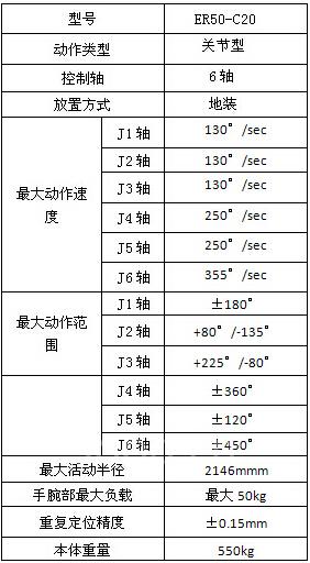 本次項目所使用的50kG六關節(jié)工業(yè)機器人是國產最新型號,具有結構緊湊,關節(jié)速度較高,動態(tài)響應快,精度高,過載能力強等特點。電控系統(tǒng)采用總線結構,擴展應用方便。適用于搬運,激光切割,打磨拋光等場合。其產品性能如下表所示: