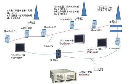 3號(hào)塔:ADAM-4572為Modbus網(wǎng)關(guān),客戶自己的產(chǎn)品——云臺(tái)通過(guò)RS-485接入,轉(zhuǎn)換成以太網(wǎng)形式傳輸?shù)奖O(jiān)控中心。通過(guò)ADAM-4017+采集數(shù)據(jù)到TPC-1251H進(jìn)行實(shí)時(shí)現(xiàn)場(chǎng)查看,以便現(xiàn)場(chǎng)實(shí)時(shí)調(diào)試和維護(hù)。