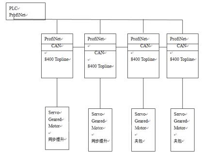 從拓撲圖可以看出,PLC 系統(tǒng)是通過 ProfitNet 與 4 臺 8400 TopLine 建立通信的。其中兩臺8400 TopLine 控制器用于完成升降。PLC 通過 ProfitNet 發(fā)送命令至升降控制的主機,主機通過CAN 總線把主機的位置值發(fā)送到升降的從機,主機在控制器主要進行速度跟隨控制,而從機則接受主機通過 CAN 總線傳遞過來的位置做位置跟隨控制,從而實現(xiàn)位置同步。在做同步跟隨之前,主機和從機都需要做位置清零的命令,保證在整個行程過程中保持位置的同步,以借此進一步保證主從控制器驅動的伺服減速機帶動的絲桿不會由于位置的不同步而受到扭力。在升降控制的控制器中,PLC 通過 ProfitNet 只發(fā)送命令到升降控制器的主機;另外兩個 8400 TopLine 夾包控制器需要完成的是力矩跟隨控制和速度跟隨控制兩種控制方式。在夾緊控制中,需要做兩次夾包控制。第一次是碰到煙箱時以較小的力矩停下來,第二次夾包是用較大的力矩把兩箱煙包夾緊,以免掉下來。