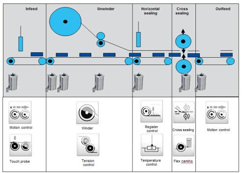 FAST 技術(shù)還體現(xiàn)了模塊化及可復(fù)用的特點(diǎn)。如下圖,在計(jì)劃設(shè)計(jì)一臺包裝設(shè)備時(shí),可通過對設(shè)備進(jìn)行模塊化分析來明確設(shè)備的技術(shù)需求及對應(yīng)可選的功能模塊。隨后在 Lenze 標(biāo)準(zhǔn)模板中調(diào)用這些可重復(fù)使用的功能模塊即可完成整個(gè)設(shè)備軟件架構(gòu)的構(gòu)建,最后只需調(diào)整某些參數(shù),并實(shí)施必要的邏輯控制即可,從而大大縮短了客戶的產(chǎn)品進(jìn)入市場的時(shí)間。