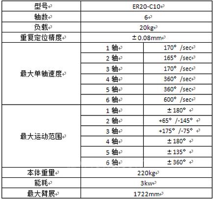 本次項目所使用的20kG六關(guān)節(jié)工業(yè)機(jī)器人是國產(chǎn)最新型號,具有結(jié)構(gòu)緊湊,關(guān)節(jié)速度較高,動態(tài)響應(yīng)快,精度高,過載能力強(qiáng)等特點。電控系統(tǒng)采用總線結(jié)構(gòu),擴(kuò)展應(yīng)用方便。適用于切割、打磨、上下料等場合。其產(chǎn)品性能如下表所示: