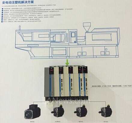 值得關(guān)注的是全電動(dòng)注塑機(jī)解決方案,此方案采用最新的“書本式”共直流母線的IS810伺服驅(qū)動(dòng)器, 該伺服驅(qū)動(dòng)器由整流單元與逆變單元組成。共直流母線結(jié)構(gòu),可節(jié)省大量的安裝空間,整機(jī)共用一個(gè)制動(dòng)系統(tǒng),可減少制動(dòng)電阻數(shù)量。此次展出的IS810伺服驅(qū)動(dòng)器包含1個(gè)整流模塊和4個(gè)逆變模塊,可以接通4臺(tái)電機(jī),分別執(zhí)行注塑機(jī)的射膠、開合、熔膠、頂針動(dòng)作。整個(gè)全電動(dòng)注塑機(jī)系統(tǒng)采用EtherCAT總線通訊,通訊速率高,接線簡(jiǎn)單。針對(duì)全電動(dòng)注塑機(jī)注射動(dòng)作,匯川技術(shù)推出了ISMQ射膠電機(jī),具有低慣量、快響應(yīng)的特性,從0到額定轉(zhuǎn)速只需10毫秒左右,可完全滿足射膠工藝的需求。