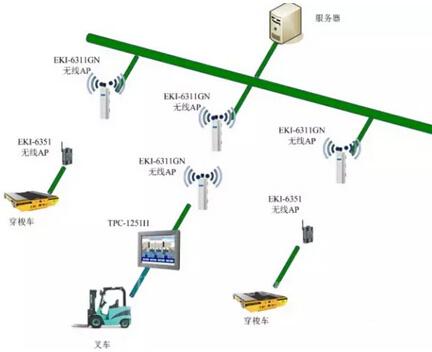 整個(gè)系統(tǒng)由穿梭車專用貨架及智能型穿梭小車組成,功能拓展后還可以和自動堆垛系統(tǒng)結(jié)合整合成集成度更高的全自動存儲系統(tǒng)。冷庫貨架系統(tǒng)使用自動化立體倉庫,在整個(gè)冷庫中使用中央控制室與冷庫中叉車、穿梭車形成一個(gè)網(wǎng)絡(luò)。現(xiàn)場存在安裝設(shè)備不方便,現(xiàn)場溫度達(dá)到零下20度以下,系統(tǒng)使用寬溫級EKI-6311GN做覆蓋,避免布線,寬溫級EKI-6351做客戶端,EKI-6351體積小,能安裝在穿梭車內(nèi),在叉車上使用寬溫級TPC-1251H與EKI-6311GN。