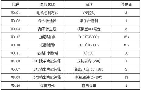 按照主回路與控制回路接線完畢,上電后根據(jù)電機(jī)銘牌參數(shù)輸入電機(jī)參數(shù)組,電機(jī)參數(shù)自學(xué)習(xí)設(shè)置為靜止自學(xué)習(xí);設(shè)置變頻器運(yùn)行參數(shù),設(shè)置控制方式為V/F 控制方式,命令源為端子臺(tái)控制、頻率源為模擬量電壓是定,運(yùn)行頻率根據(jù)需求設(shè)置,加減速時(shí)間設(shè)置為15秒、電機(jī)類型設(shè)置為普通異步電機(jī)。
