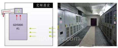 由于變頻器數(shù)量較多,而且客戶現(xiàn)場(chǎng)變頻器室空間有限,熱量不容易散發(fā),正常情況下室內(nèi)需要裝配空調(diào)進(jìn)行冷卻。一般情況下,變頻器大約4%的能量以熱量的形式耗散,則9臺(tái)機(jī)器總散熱功率為320kW,在不考慮其它因素的情況下,需要總功率約為128匹的空調(diào)(1匹空調(diào)的制冷量大約為2.5kW),每年按運(yùn)行300天來(lái)算,則產(chǎn)生的電費(fèi)為677376元,由此產(chǎn)生的電費(fèi)是一筆不小的數(shù)目。為了給客戶節(jié)省成本,我司技術(shù)人員經(jīng)過(guò)多次實(shí)地考察和周密的分析計(jì)算,決定采用風(fēng)道式散熱方式,即將變頻器產(chǎn)生的熱風(fēng)通過(guò)風(fēng)道直接排到室外,這樣可節(jié)省空調(diào)設(shè)備、電費(fèi)等一系列的開(kāi)支。另外,進(jìn)風(fēng)孔還加裝過(guò)濾網(wǎng),做了防塵處理。實(shí)踐證明,此種冷卻方式既簡(jiǎn)單又經(jīng)濟(jì),維護(hù)也方便,完全滿足客戶要求。