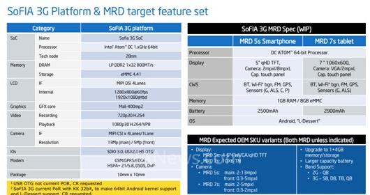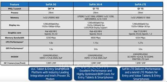SoFIA 3G-R+:四核平臺(tái),包含與3G調(diào)制解調(diào)器集成的英特爾凌動(dòng)處理器,由英特爾的開(kāi)發(fā)合作伙伴瑞芯微制造;