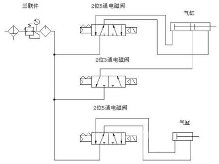 該卷煙廠整個氣路只有兩個執(zhí)行元件:一個是雙行程氣缸(單活塞桿型),另一個是帶導桿氣缸。有三個控制元件為2個2位5通單電控電磁閥和一個2位3通電磁閥。氣路結(jié)構(gòu)如圖1所示。