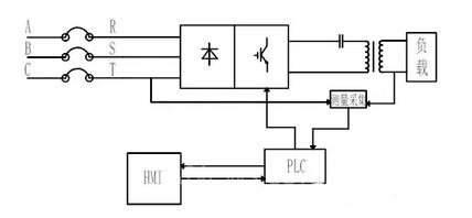 該系統(tǒng)使用一臺CHF100A中頻變頻器,16點IVC1型號PLC,一塊4AD模數(shù)轉(zhuǎn)換模塊,一塊7寸VF觸摸屏構(gòu)成。其中變頻器作為加熱電源,外部溫度檢測信號和互感器檢測電流、電壓信號經(jīng)4AD模塊送入PLC, PLC作為主控原件控制變頻器完成加熱作業(yè)。觸摸屏作為操作界面,將控制命令傳達(dá)到PLC,同時顯示相關(guān)運行參數(shù),實時了解工作狀態(tài)。