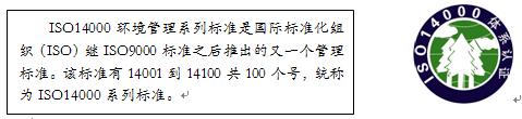 ISO14000環(huán)境管理系列標(biāo)準(zhǔn)是國(guó)際標(biāo)準(zhǔn)化組織(ISO)繼ISO9000標(biāo)準(zhǔn)之后推出的又一個(gè)管理標(biāo)準(zhǔn)。該標(biāo)準(zhǔn)有14001到14100共100個(gè)號(hào),統(tǒng)稱(chēng)為ISO14000系列標(biāo)準(zhǔn)。