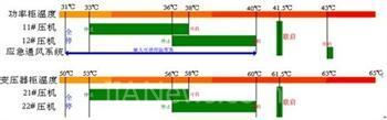 裝置根據(jù)變頻器功率柜和變壓器柜柜頂排風(fēng)口的溫度檢測信號,實現(xiàn)變頻器箱體內(nèi)環(huán)境溫度控制,將功率柜內(nèi)的溫度控制在30~38℃和變壓器柜內(nèi)的溫度控制在53~58℃的一個寬帶范圍內(nèi)。當(dāng)變頻器功率柜頂排風(fēng)口溫度測點2的信號到達38℃時,啟動其中的11#壓機工作;當(dāng)變頻器負(fù)荷過高,單臺壓機不能維持變頻器功率柜溫度穩(wěn)定時,電控系統(tǒng)在41.5℃自動啟動第二臺12#壓機。溫度在控制過程中仍不能達到溫度穩(wěn)定的,功率柜溫度上升至43℃時,自動打開應(yīng)急通風(fēng)系統(tǒng),進行開放式循環(huán)。