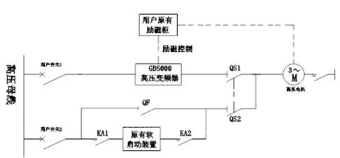 整個切換方案用戶原有變頻軟起、KA1、KA2、QF、原有勵磁柜和新上變頻器、手動刀閘QS1、QS2組成。在變頻運(yùn)行時QS1合閘QS2斷開。當(dāng)變頻器出現(xiàn)故障時用戶原有軟啟動部分啟動后進(jìn)行工頻運(yùn)行,此時QS2合閘QS1斷開。QS1和QS2電氣連鎖能夠保證五聯(lián)防要求。