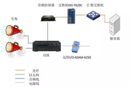 聲音告警設(shè)備能自動播放錄音警告和實時喊話警告。當現(xiàn)場有報警信號發(fā)生時,控制中心根據(jù)警報等級,監(jiān)控軟件通過視頻服務(wù)器NVR的音頻口輸出警告音頻信號;同時,現(xiàn)場I/O控制器根據(jù)防區(qū)對應(yīng)邏輯關(guān)系,通過I/O控制器接通室外號角式揚聲器和音頻功放電源,室外揚聲器播放警告音。