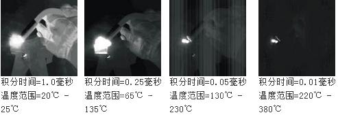 圖1 - 4:極端溫度下的一組焊接連續(xù)鏡頭:積分或曝光時(shí)間越短,溫度范圍就越高,黑色或噪點(diǎn)區(qū)域也越大。