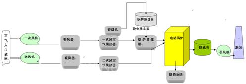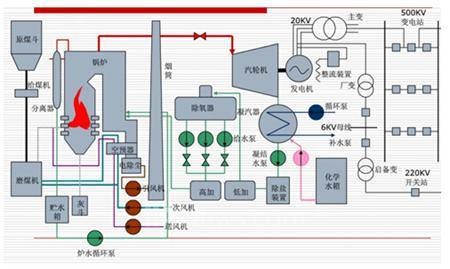 鍋爐燃燒的具體的過程是,煤斗中的原煤要先送至球磨機(jī)內(nèi)磨成煤粉。經(jīng)過空預(yù)器加熱后的一次風(fēng)機(jī)的熱空氣吹入球磨機(jī)攜帶煤粉送入鍋爐的爐膛內(nèi)燃燒,同時(shí)送風(fēng)機(jī)的空氣經(jīng)過空預(yù)器加熱后和煤粉混合使燃燒更加充分。煤粉燃燒后形成的熱煙氣沿鍋爐的水平煙道和尾部煙道流動(dòng),放出熱量,最后進(jìn)入除塵器,除塵器將燃燒后的煤灰分離出來。潔凈的煙氣在引風(fēng)機(jī)的作用下通過煙囪排入大氣。助燃用的空氣由送風(fēng)機(jī)送入裝設(shè)在尾部煙道上的空氣預(yù)熱器內(nèi),利用熱煙氣加熱空氣。這樣,一方面使進(jìn)入鍋爐的空氣溫度提高,易于煤粉的著火和燃燒,另一方面也可以降低排煙溫度,提高熱能的利用率。從空氣預(yù)熱器排出的熱空氣分為兩股:一股去磨煤機(jī)干燥和輸送煤粉,另一股直接送入爐膛助燃。燃煤燃盡的灰渣落入爐膛下面的渣斗內(nèi),與從除塵器分離出的細(xì)灰一起用水沖至灰漿泵房?jī)?nèi),再由灰漿泵送至灰場(chǎng)。一次風(fēng)和和送風(fēng)機(jī)工藝流程圖如下圖1所示,發(fā)電流程圖如下圖2所示。