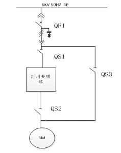 QS1、QS2、QS3為3個(gè)隔離刀閘,QS1、QS2處于變頻運(yùn)行回路上,QS3為用戶工頻回路隔離刀閘。QS2與QS3采用機(jī)械和電氣互鎖,確保不向變頻器輸出端反送電。當(dāng)變頻運(yùn)行時(shí),QS1、QS2閉合,QS3斷開,合QF1電機(jī)變頻運(yùn)行;斷開QS1、QS2,合上QS3,合QF1,電機(jī)工頻運(yùn)行。這是高壓變頻器工變頻手動(dòng)切換的典型應(yīng)用。