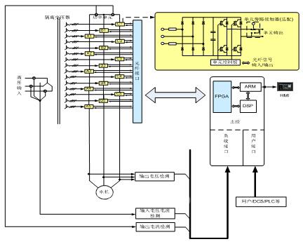 功率單元采用三相交流輸入,整流濾波后形成直流電壓,經(jīng)IGBT的H橋逆變后輸出脈寬調(diào)制(PWM)電壓。功率單元控制板由IGBT驅(qū)動(dòng)電路和監(jiān)測(cè)保護(hù)電路、光纖通信電路、單元旁路電路和控制電源組成。運(yùn)行中功率單元故障時(shí),變頻器可將故障單元自動(dòng)旁路并繼續(xù)運(yùn)行,等情況允許時(shí)再停機(jī)排除故障。(其中單元旁路功能為選配,用戶可根據(jù)實(shí)際需要選擇)