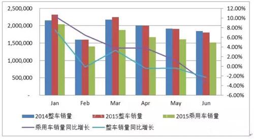 2015年上半年,汽車銷量持續(xù)了上一年的下跌趨勢,可謂跌至谷底。據(jù)中國汽車工業(yè)協(xié)會(huì)數(shù)據(jù)顯示,汽車行業(yè)整體產(chǎn)量為1209.50萬輛,同比增長2.64%,銷量為1185.03萬輛,同比增長1.43%。其中乘用車產(chǎn)銷量分別為1032.78萬輛和1009.56萬輛,同比增長為6.38%和4.80%。整車進(jìn)口53.18萬輛,同比下降23.52%,出口39.9萬輛,同比下降8.94%。