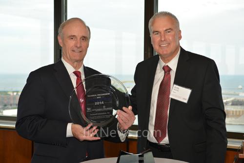 羅克韋爾自動化董事長兼首席執(zhí)行官Keith Nosbusch(左)接受由雀巢技術(shù)采購主管Andy Murray(右)頒發(fā)的2014年雀巢北美采購供應(yīng)商獎