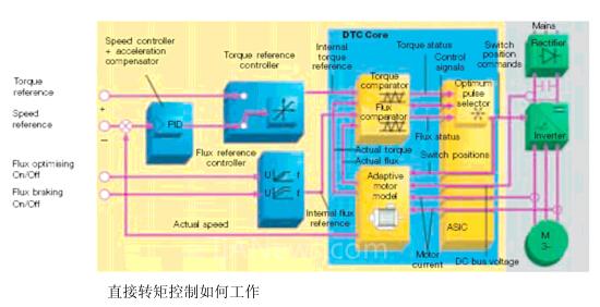與傳統(tǒng)的交流變頻器控制不同, DTC確保交流電機(jī)轉(zhuǎn)矩為首要控制元素, 而不是電機(jī)電流。 采用了DTC控制的電機(jī),電流是實(shí)現(xiàn)所需轉(zhuǎn)矩的結(jié)果。
