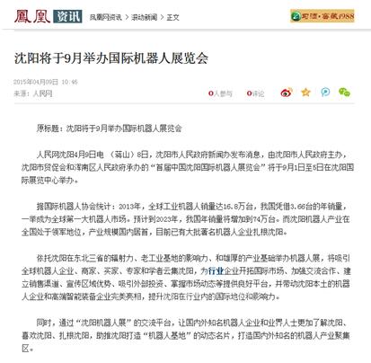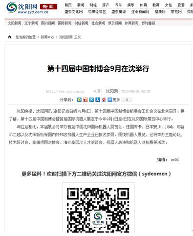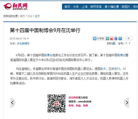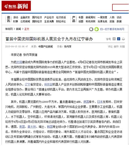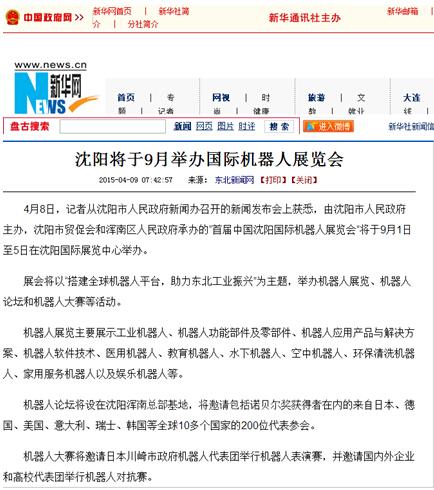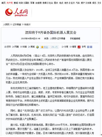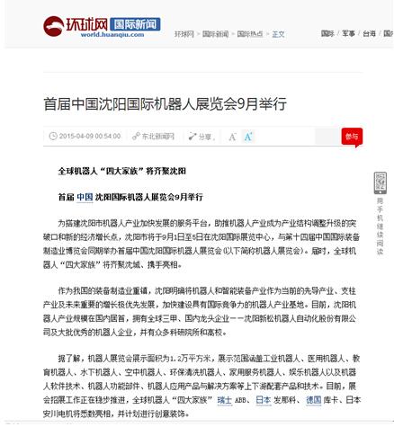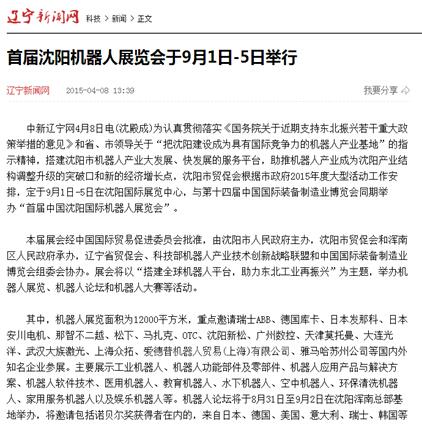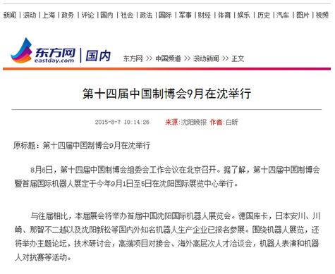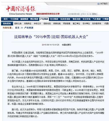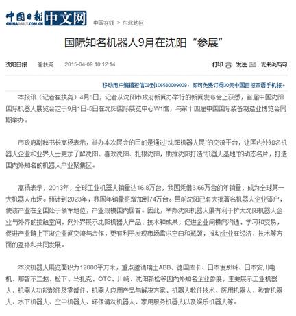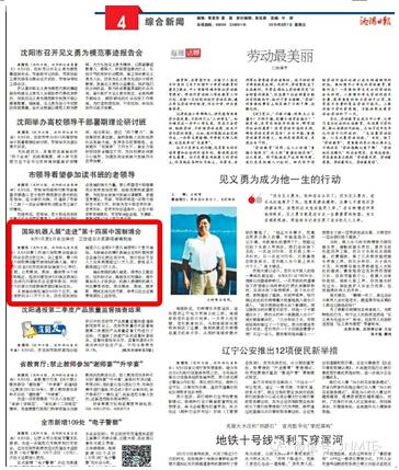 《沈陽日報》 關(guān)于2015制博會首屆“中國沈陽國際機器人展”的報道