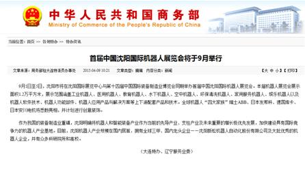 《中華人民共和國商務(wù)部》網(wǎng)站關(guān)于制博會首屆“中國沈陽國際機器人展”的信息
