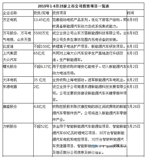 據(jù)完全統(tǒng)計(jì),2015年以來(lái),已有方正電機(jī)、萬(wàn)馬股份、比亞迪、上汽集團(tuán)、大洋電機(jī)、多氟多等25家上市公司通過(guò)募集資金等各種形式擴(kuò)大新能源汽車(chē)相關(guān)業(yè)務(wù)的投資,這些投資包括新能源汽車(chē)整車(chē)、動(dòng)力電池、充電設(shè)施、動(dòng)力總成系統(tǒng)、租賃等領(lǐng)域,其中“供不應(yīng)求”的動(dòng)力電池和充換電設(shè)施,成為其投資的兩大重點(diǎn)領(lǐng)域。2015年1-6月以來(lái)25家上市公司投資新能源汽車(chē)產(chǎn)業(yè)鏈項(xiàng)目的資金總規(guī)模已超534.35億元。