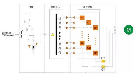 目前,因?yàn)楣β势骷蛪旱南拗疲邏鹤冾l器沒有像低壓變頻器一樣,有統(tǒng)一的拓?fù)浣Y(jié)構(gòu)。目前,市場(chǎng)上主流的高壓變頻器多采用單元串聯(lián)多電平的拓?fù)浣Y(jié)構(gòu),系統(tǒng)結(jié)構(gòu)如圖2所示:
