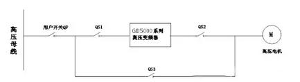 主回路由用戶開關(guān)、3個(gè)高壓隔離開關(guān)QS1、QS2和QS3及高壓變頻器組成(如圖3)。其中要求QS2和QS3不能同時(shí)閉合,在機(jī)械上實(shí)現(xiàn)互鎖。高壓隔離開關(guān)QS1、QS2、SQ3加裝電磁鎖,電磁鎖的操作電源使用用戶開關(guān)的輔助觸點(diǎn)閉鎖。只有當(dāng)用戶開關(guān)斷開時(shí),QS1、QS2、SQ3的電磁鎖才能得電,可以正常操作。在變頻運(yùn)行時(shí),QS1和QS2閉合,QS3斷開,變頻器得電啟動(dòng)后,電機(jī)處于變頻運(yùn)行狀態(tài);工頻運(yùn)行時(shí),QS3閉合,QS1和QS2斷開,用戶開關(guān)閉合后,電機(jī)實(shí)現(xiàn)工頻直接啟動(dòng),恢復(fù)改造前的運(yùn)行狀態(tài)。