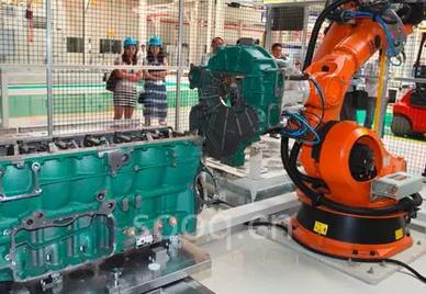 一汽解放汽車有限公司 無錫柴油機(jī)廠是一汽集團(tuán)的全資子公司,其惠山重型柴油機(jī)生產(chǎn)新基地已于 2012 年 2 月竣工投產(chǎn),年產(chǎn)量為 125000 臺。在此,來自德國奧格斯堡的KUKA機(jī)器人擔(dān)任著頗為廣泛的工作范圍。而其中的亮點(diǎn)是:庫卡機(jī)器人 KR 1000 TITAN 搬運(yùn)重達(dá) 700 kg 的氣缸體。