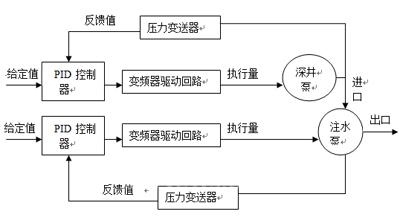 在PID控制下,使用一個(gè)4mA對(duì)應(yīng)0Mpa。20ma對(duì)應(yīng)1Mpa的壓力變送器調(diào)節(jié)水源井深井泵的供水壓力,另使用一個(gè)4ma對(duì)應(yīng)0mpa,20mpa對(duì)應(yīng)25mpa的壓力變送器調(diào)節(jié)注水泵壓力,設(shè)定值通過變頻器端子(0-10V)給定。整個(gè)系統(tǒng)在運(yùn)行中,當(dāng)出現(xiàn)缺相、變頻器故障、超壓時(shí),系統(tǒng)會(huì)自動(dòng)停機(jī),并發(fā)出報(bào)警信號(hào),維修人員及時(shí)維護(hù)處理,使其恢復(fù)正常。此外,變頻器故障時(shí),系統(tǒng)可切換至手動(dòng)方式,用備用工頻方式運(yùn)行,保證注水生產(chǎn)。變頻器的軟起動(dòng)功能還減少了設(shè)備電動(dòng)機(jī)啟動(dòng)的沖擊電流,從而有效保護(hù)設(shè)備、電網(wǎng)等,延長(zhǎng)設(shè)備的使用壽命。