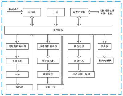 電腦繡花機(jī)的基本功能就是通過(guò)控制各電機(jī)協(xié)同配合工作,在布料上按照花樣數(shù)據(jù)形成針跡完成刺繡過(guò)程?;游募梢酝ㄟ^(guò)如軟盤(pán)、U盤(pán)等存儲(chǔ)介質(zhì)拷貝到控制系統(tǒng)內(nèi)部的存儲(chǔ)器中,控制系統(tǒng)根據(jù)花樣的要求來(lái)控制電機(jī)及其檢測(cè)機(jī)構(gòu),使其協(xié)同工作,完成繡花功能。繡花機(jī)工作時(shí),主軸電機(jī)通過(guò)傳動(dòng)輪帶動(dòng)針桿上下運(yùn)動(dòng),而X軸和Y軸的步進(jìn)電機(jī)帶動(dòng)著繡框在X、Y軸方向運(yùn)動(dòng),刺繡品隨繡框運(yùn)動(dòng),從而刺繡出圖案。當(dāng)需要換色時(shí),主控制器通過(guò)控制換色電機(jī)轉(zhuǎn)動(dòng),通過(guò)換色機(jī)構(gòu)帶動(dòng)換色桿移動(dòng),將穿有其它顏色線的針換上,繼續(xù)刺繡。電腦繡花機(jī)控制系統(tǒng)由主控電路和外部設(shè)備構(gòu)成,控制系統(tǒng)的結(jié)構(gòu)框圖如下。