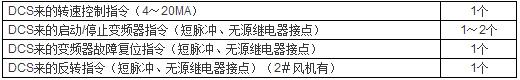 啟動、停車以及風(fēng)機(jī)轉(zhuǎn)速調(diào)節(jié)等所有功能都由中央控制室(DCS)操縱。為滿足這些要求,要求變頻裝置控制柜與中央控制室(DCS)交換相關(guān)的指令和信號。