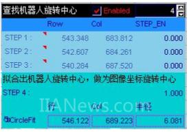 3)得到這三張圖像后,就可以在這三張圖像上用 PatMax 工具查找同一特征點,根據(jù)得到的三個點就可以擬合出一個圓,這個圓的圓心坐標就是機器人夾具的旋轉(zhuǎn)中心。具體如圖 9、圖 10 所示。