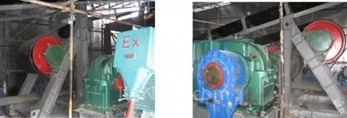 2、卸完煤后的空皮帶經(jīng)過一個轉(zhuǎn)向輪,分別通過1#電機拖動的主動滾筒和2#電機拖動的從動滾筒后,皮帶在經(jīng)過一個導(dǎo)向輪運行到井底完成一次運煤過程。1#電機、滾筒及導(dǎo)向輪的現(xiàn)場工況如圖2所示。2#電機、滾筒及導(dǎo)向輪的現(xiàn)場工況如圖3所示;